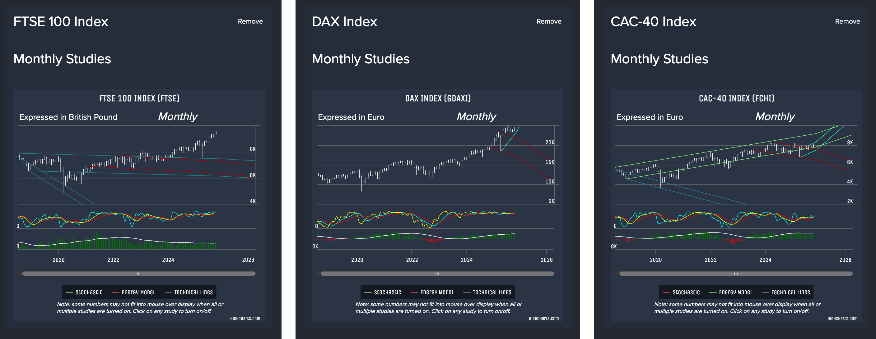 Europe: (UK) FTSE 100 Index, (Germany) DAX Performance Index, (France) CAC-40 Index