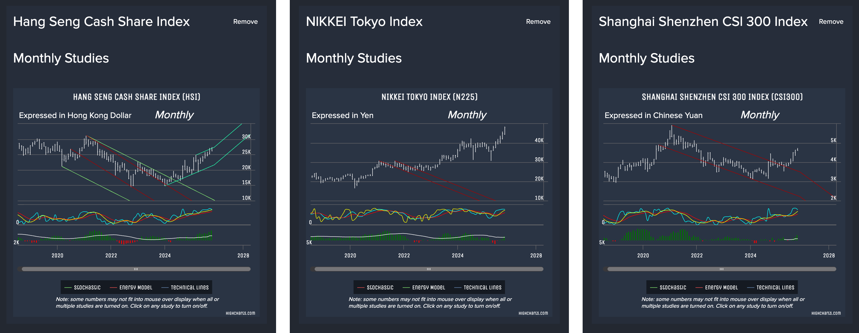 Asia: (Hong Kong) Hang Seng Index, (Japan) Nikkei Index, (China) CSI 300 Index