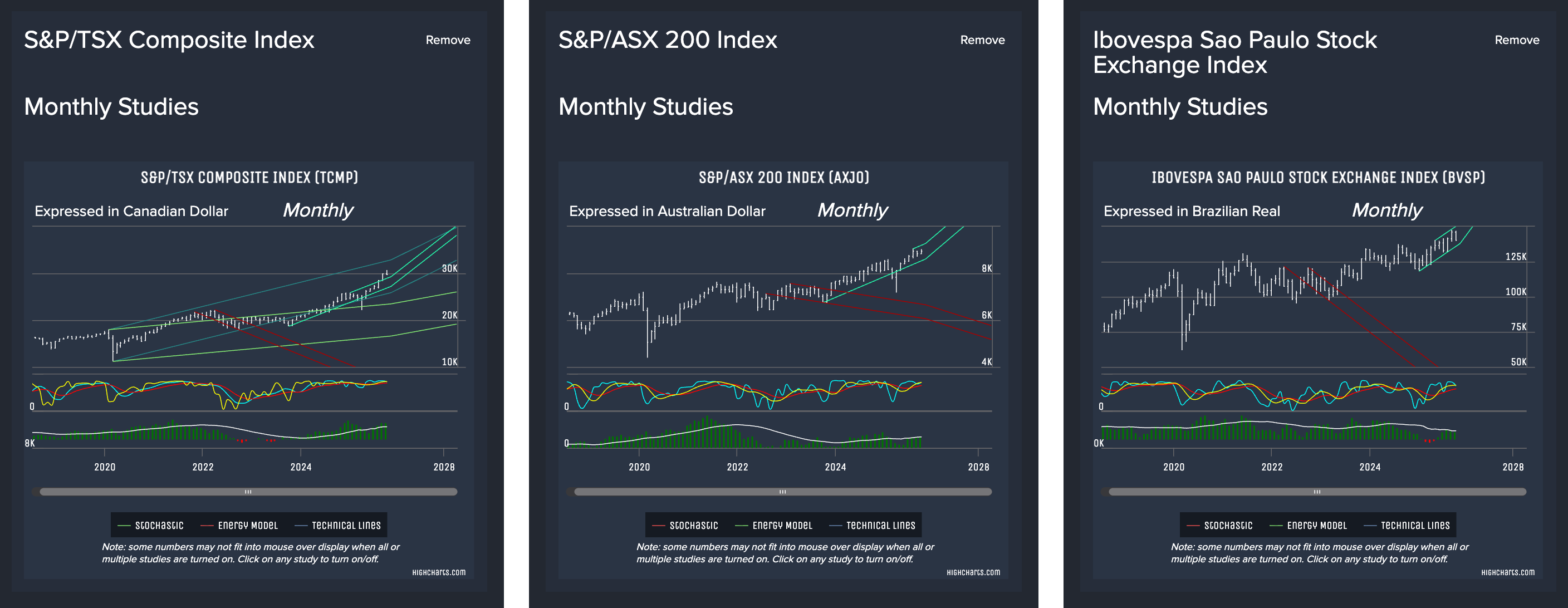 Now, let's take a look at some price charts. In this post we'll focus on Monthly perspective, but it's good to study performance across multiple time levels (Daily, Weekly, Monthly, etc). Within the Socrates Platform, pay attention to the Energy Model (green and red bars at the bottom of the price chart) as well as the Stochastic oscillator (blue, red, yellow lines). See more below on how to consider these studies as part of your research.